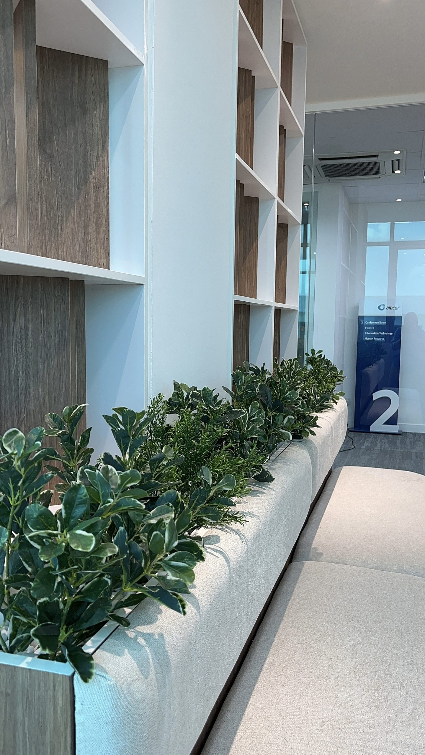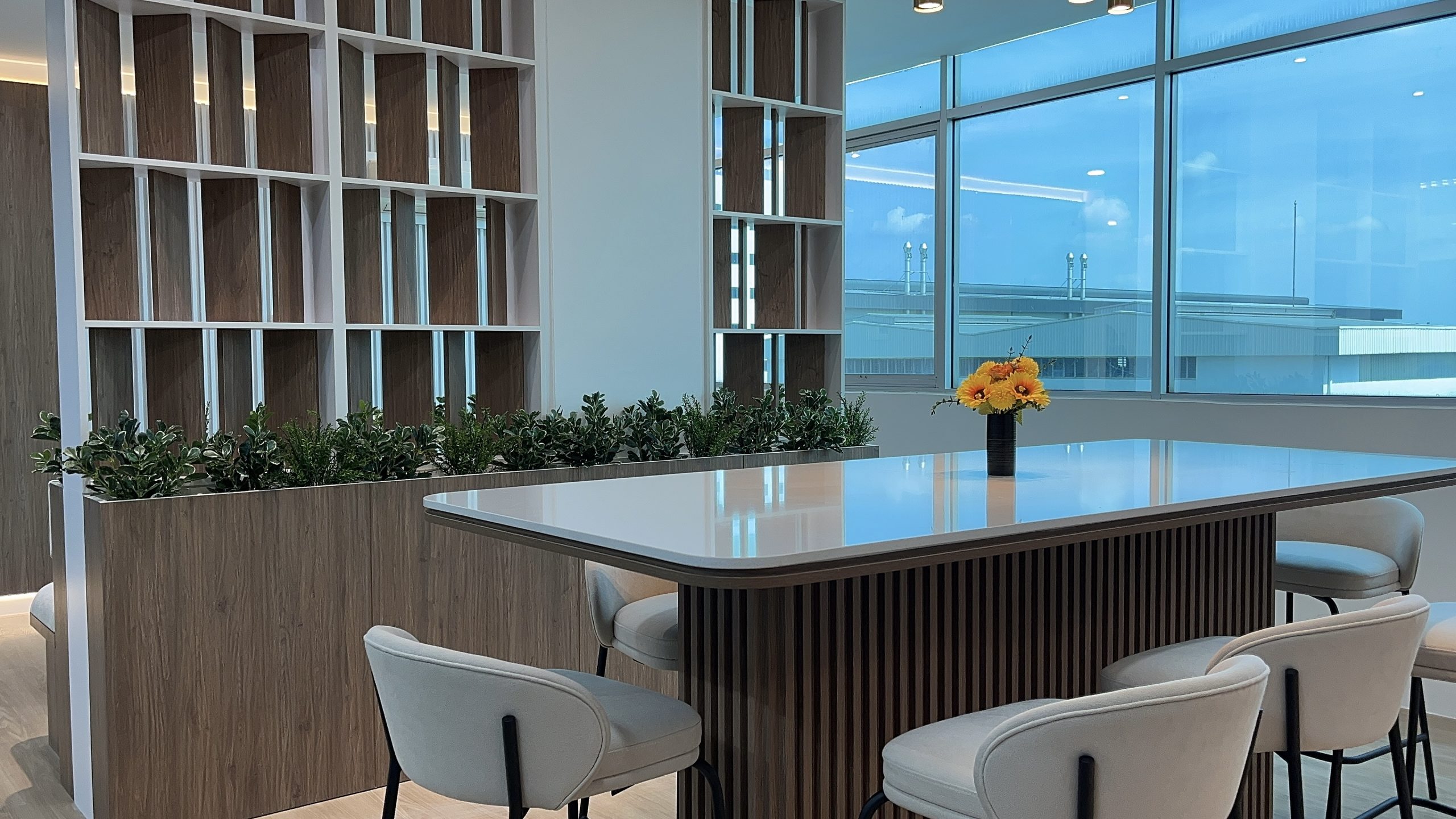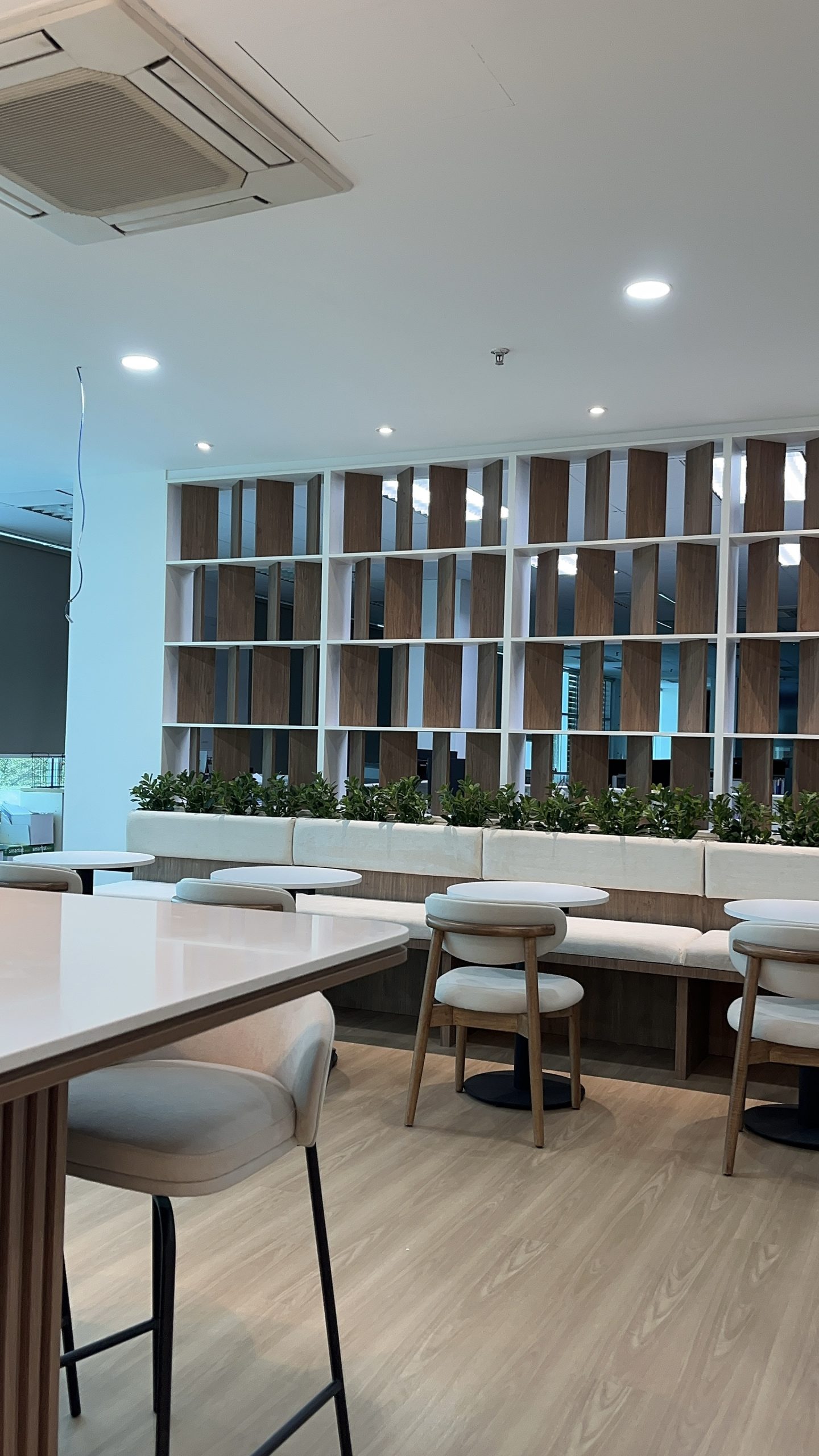 A grand first impression, designed to reflect Amcor’s identity from the moment you step in. From the statement entrance and curated greenery to an open workspace elevated with natural elements and warm wooden panels. A custom marble-finish discussion table anchors collaboration, while cafe-style seating brings comfort into the workday.