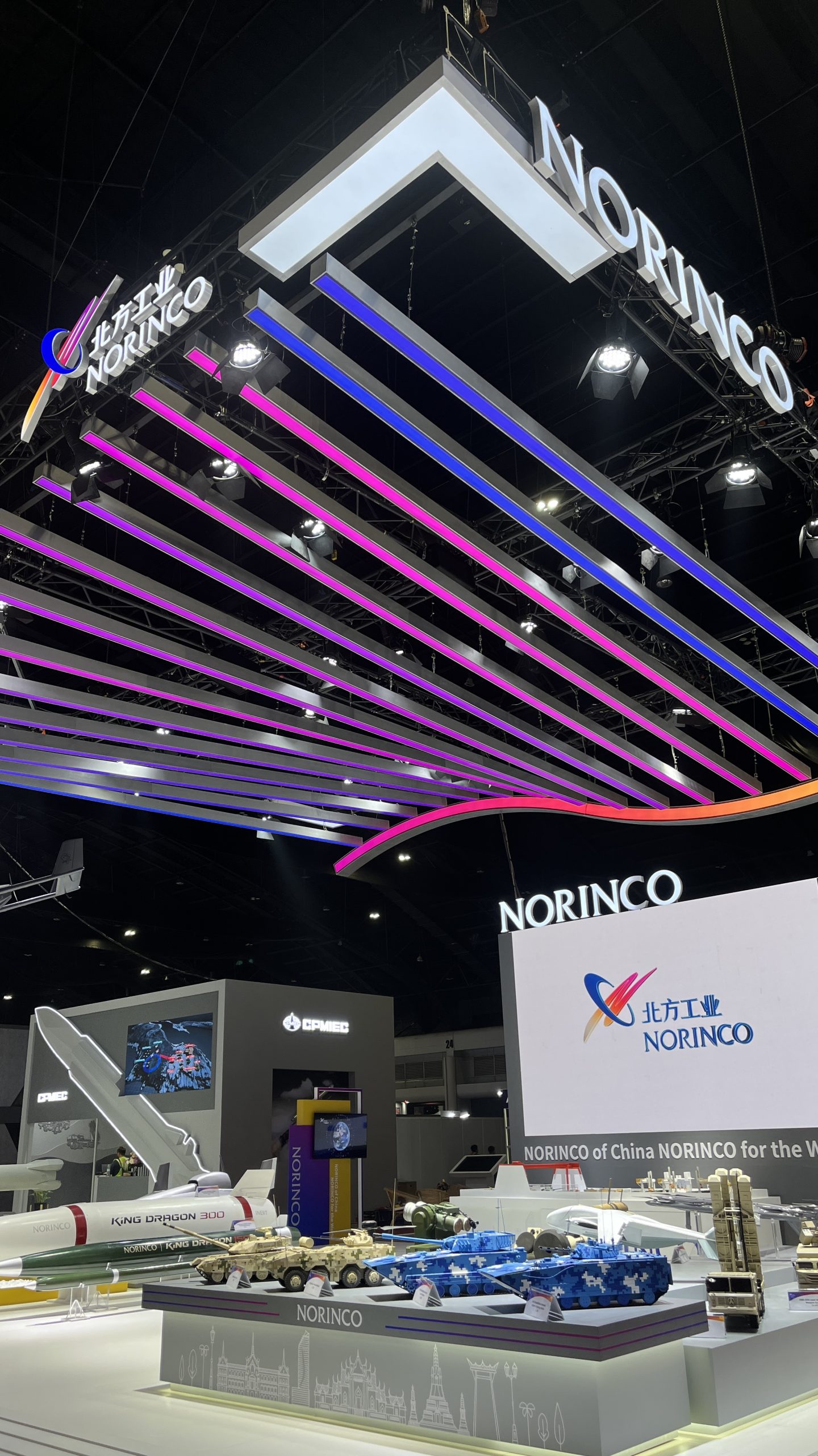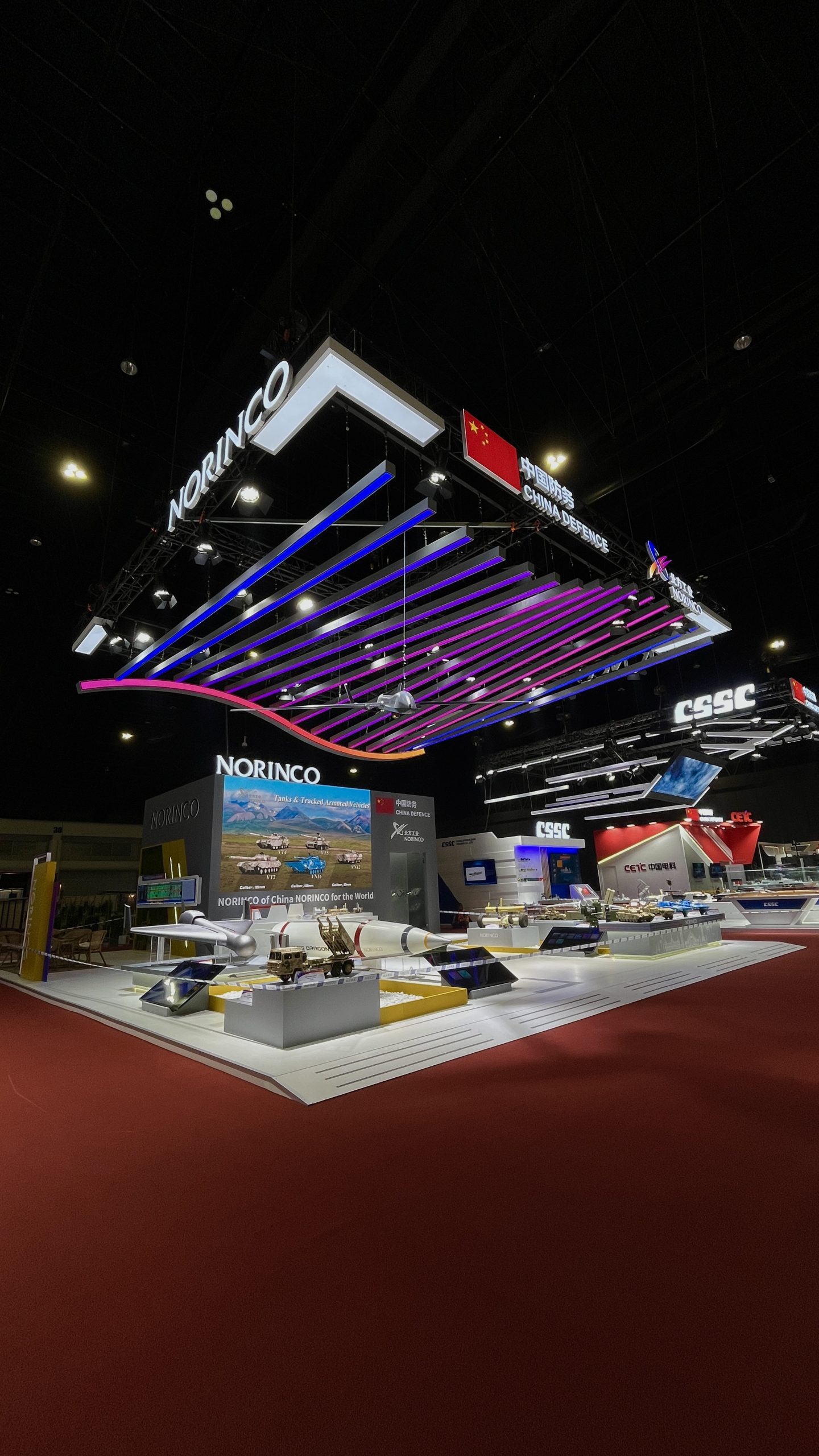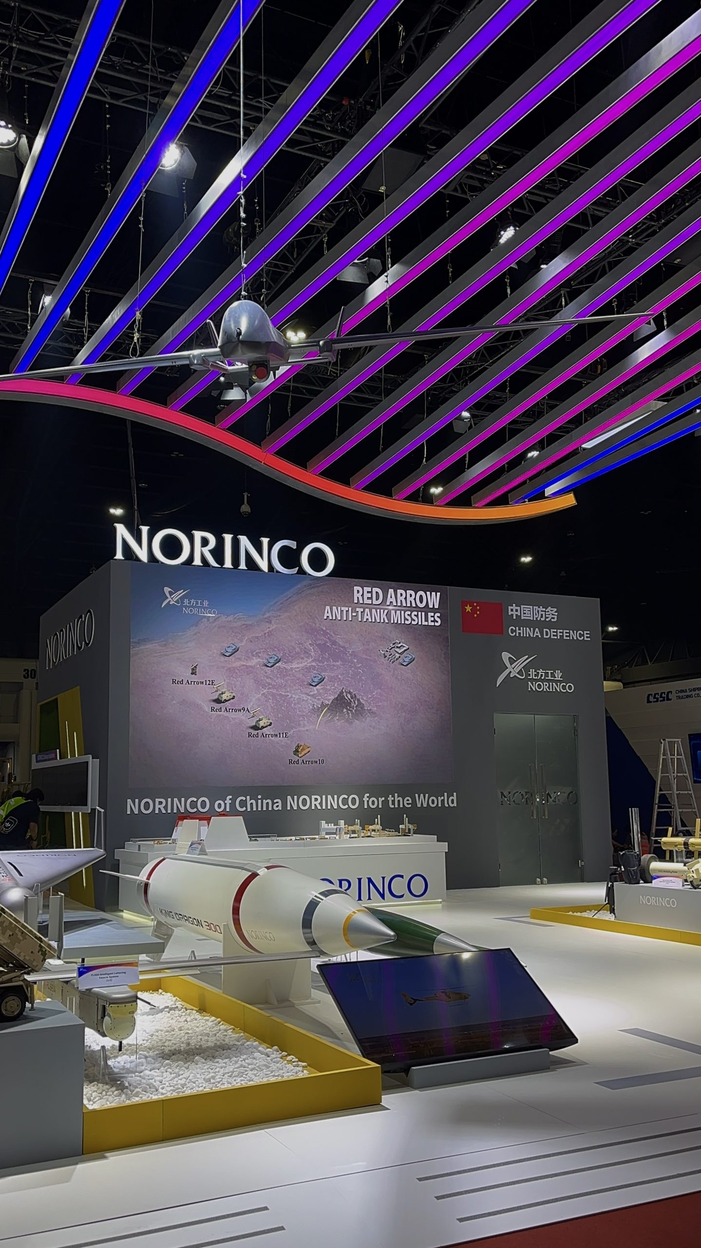 Dynamic booth, featuring gradient LED strips suspended from the truss to mirror the colors of the brand’s logo. A model aircraft was also hung from the truss, creating a captivating focal point that showcased the company’s capabilities to the live audience.