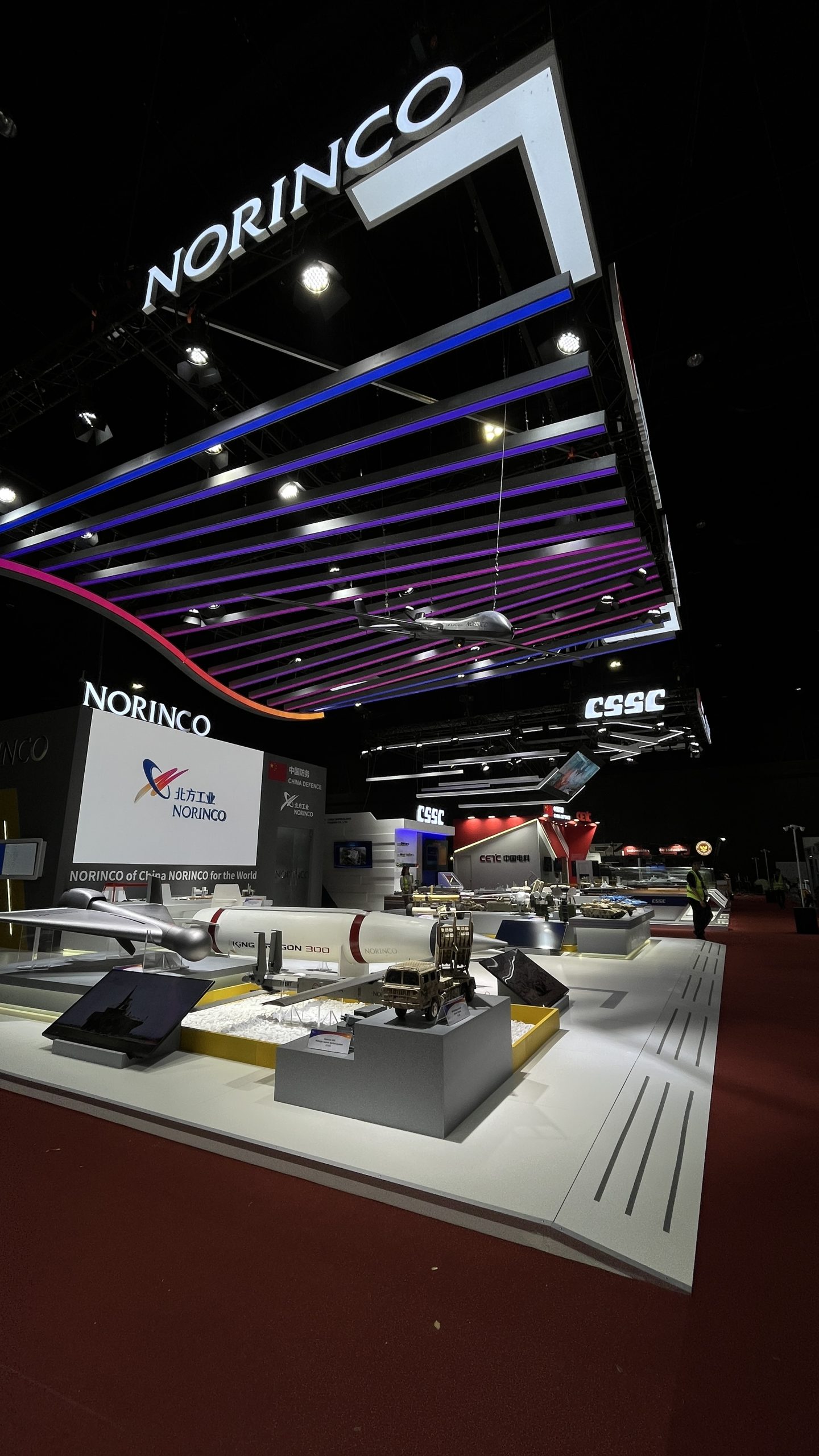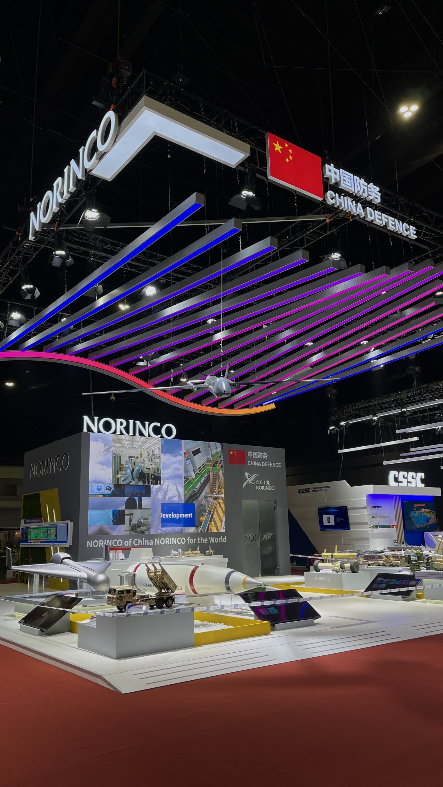 The booth was designed to command attention and reflect the brand’s cutting-edge military defence capabilities. A distinctive series of LED pelmets with concealed lighting formed a flowing, wave-like ceiling, creating a striking rainbow that drew visitors from across the hall. Anchoring the space, a suspended fighter jet installation delivered a bold visual centerpiece, reinforcing the brand’s strength, precision and technological dominance.